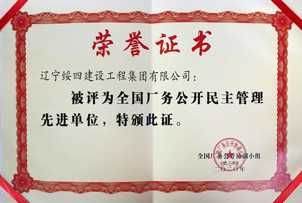 2020年8月,遼寧綏四建工集團(tuán)喜獲“全國廠務(wù)公開民主管理先進(jìn)單位”榮譽(yù)稱號(hào)。