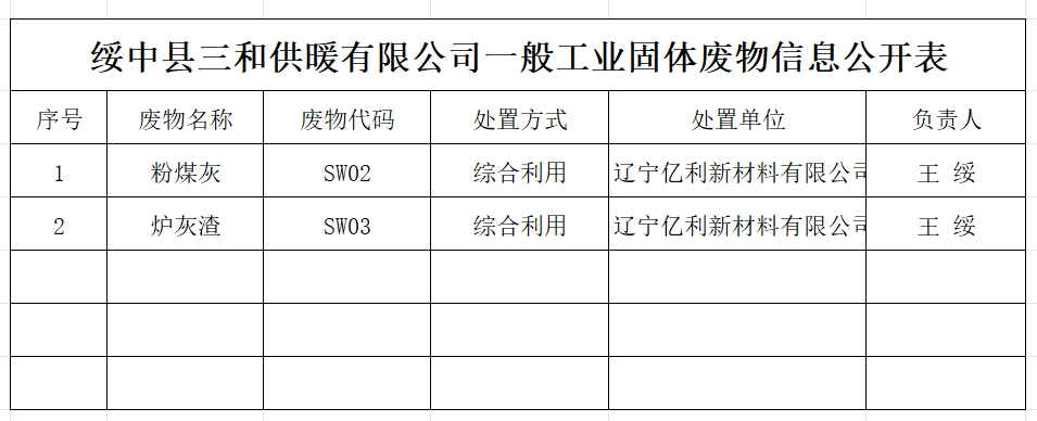 綏中縣三和供暖有限公司一般工業(yè)固體廢物信息公開(kāi)表