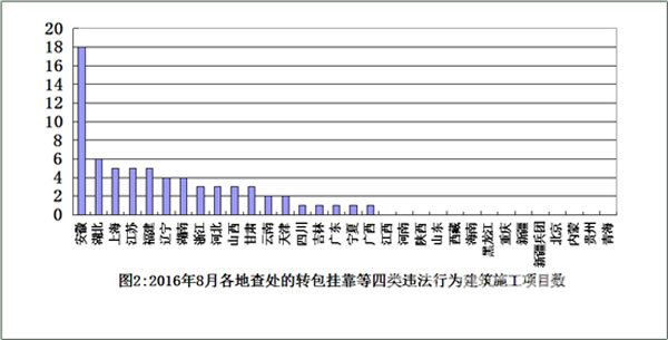 從查處的轉(zhuǎn)包、掛靠等四類(lèi)違法行為看,安徽、湖北省查處項(xiàng)目相對(duì)較多(見(jiàn)圖2)。
