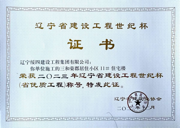 榮獲二0二三年遼寧省建設(shè)工程世紀(jì)杯(省優(yōu)質(zhì)工程)稱號(hào)