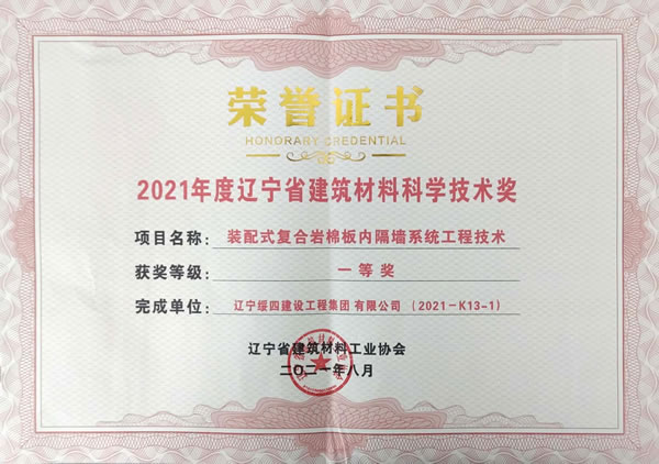 2021年度遼寧省建筑材料科學(xué)技術(shù)一等獎