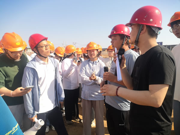 施工現(xiàn)場,于海部長向同學(xué)們詳細介紹了項目工程概況、工程進度、設(shè)計理念等內(nèi)容,段文博向同學(xué)們介紹了施工工藝和當前土方回填、基礎(chǔ)施工等情況。參觀過程中對同學(xué)們提出的問題進行現(xiàn)場解答,確保理論與實踐融合,讓參觀學(xué)習(xí)走實又走心。