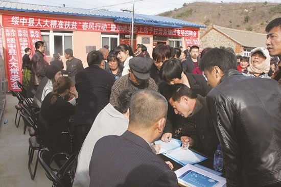 2016年3月22日,我公司參加了由縣人大主辦,縣勞動(dòng)和社會(huì)保障局、加碑巖鄉(xiāng)政府、扶貧辦、新聞中心承辦的“綏中縣人大精準(zhǔn)扶貧春風(fēng)行動(dòng)暨加碑巖鄉(xiāng)上房子村勞務(wù)輸出專場(chǎng)招聘會(huì)”。 縣委書記、東戴河新區(qū)黨工委書記劉旭東參加并作講話。縣人大常委會(huì)主任王躍明宣布招聘活動(dòng)開始。縣委副書記王興華,縣委常委、紀(jì)委書記項(xiàng)繼飛,縣人大常委會(huì)副主任杜鐵耕、郭勇,副縣長袁伶,縣長助理邱玉峰及相關(guān)部門負(fù)責(zé)人參加招聘會(huì)開幕式,上房子村及周邊6個(gè)村屯上千人參加了招聘活動(dòng)。